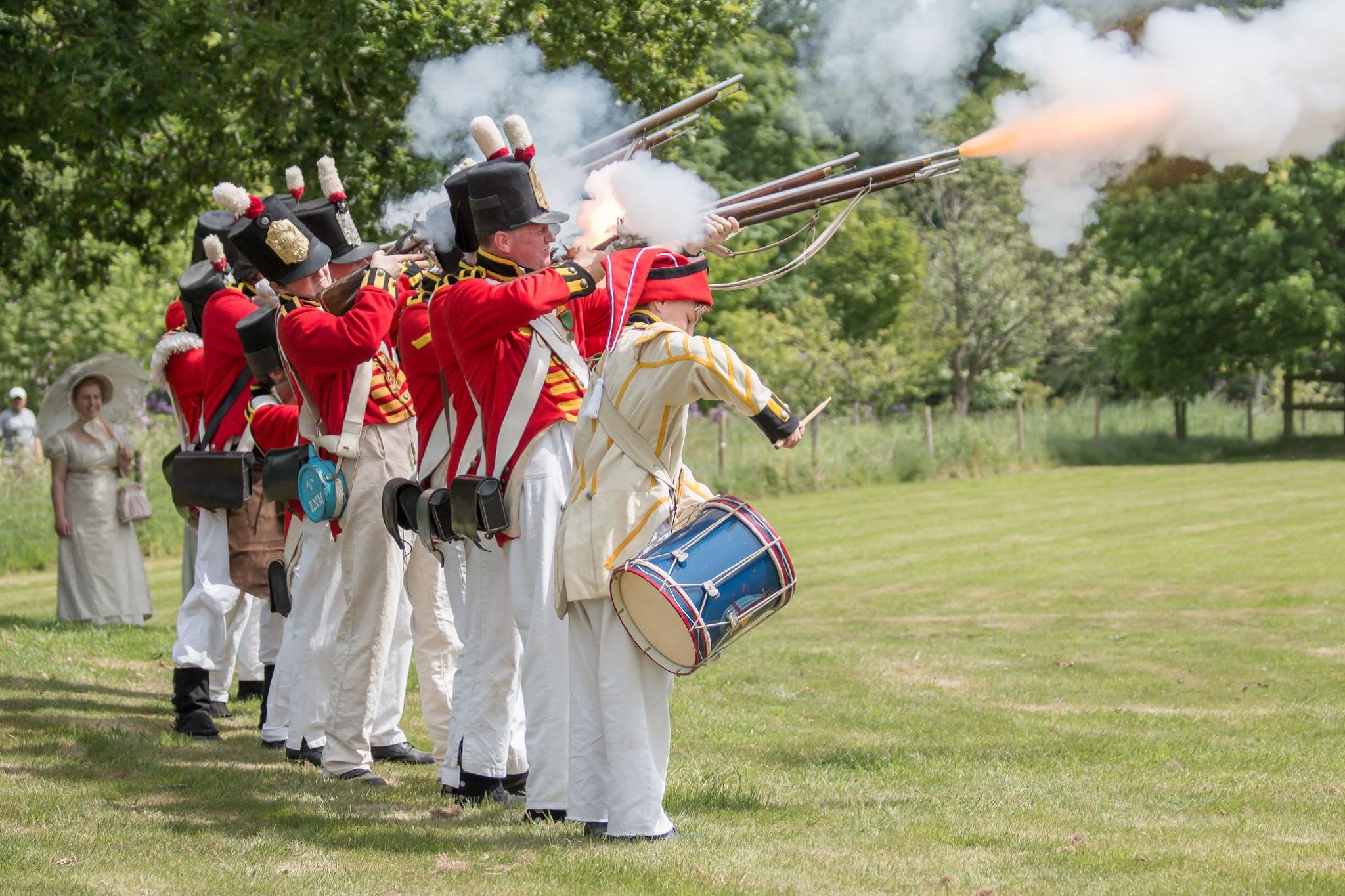 We have previously attended product launches and ceremonial processions, acting as a period backdrop to a wider event. In addition, we are a popular entertainment at smaller events such as fetes in addition to the more obvious living history events. The evocotive crash of musketry and the resulting cloud of smoke is as popular a crowd pleaser today as it was two hundred years ago, and in addition to drill, marching and firepower demonstrations and mock battles East Norfolk Militia can also put on a full scale living history camp where the public can walk through and see the sights, sounds and smells of two hundred years ago. We can also put on semi scripted plays, depicting the events of two hundred years ago.
